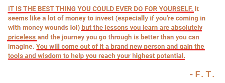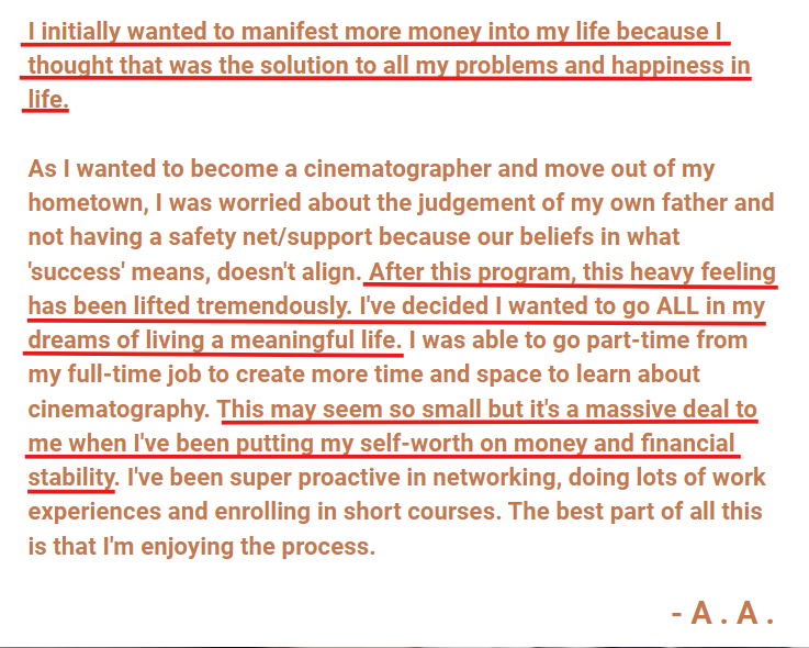 That's why I designed this course to help you dissolve your money trauma, free yourself of scarcity and conditioned money fears, to finally shift into abundance and unlock freedom like you’ve never felt before.